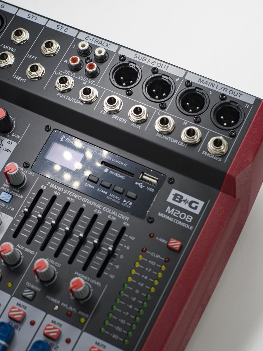 BG M208 Пульт микшерный, 6 моно, 2 стерео, USB/SD MP3 плеер, процессор эффектов, 7 полосный эквалайзер, 2 подгруппы, фантомное питание