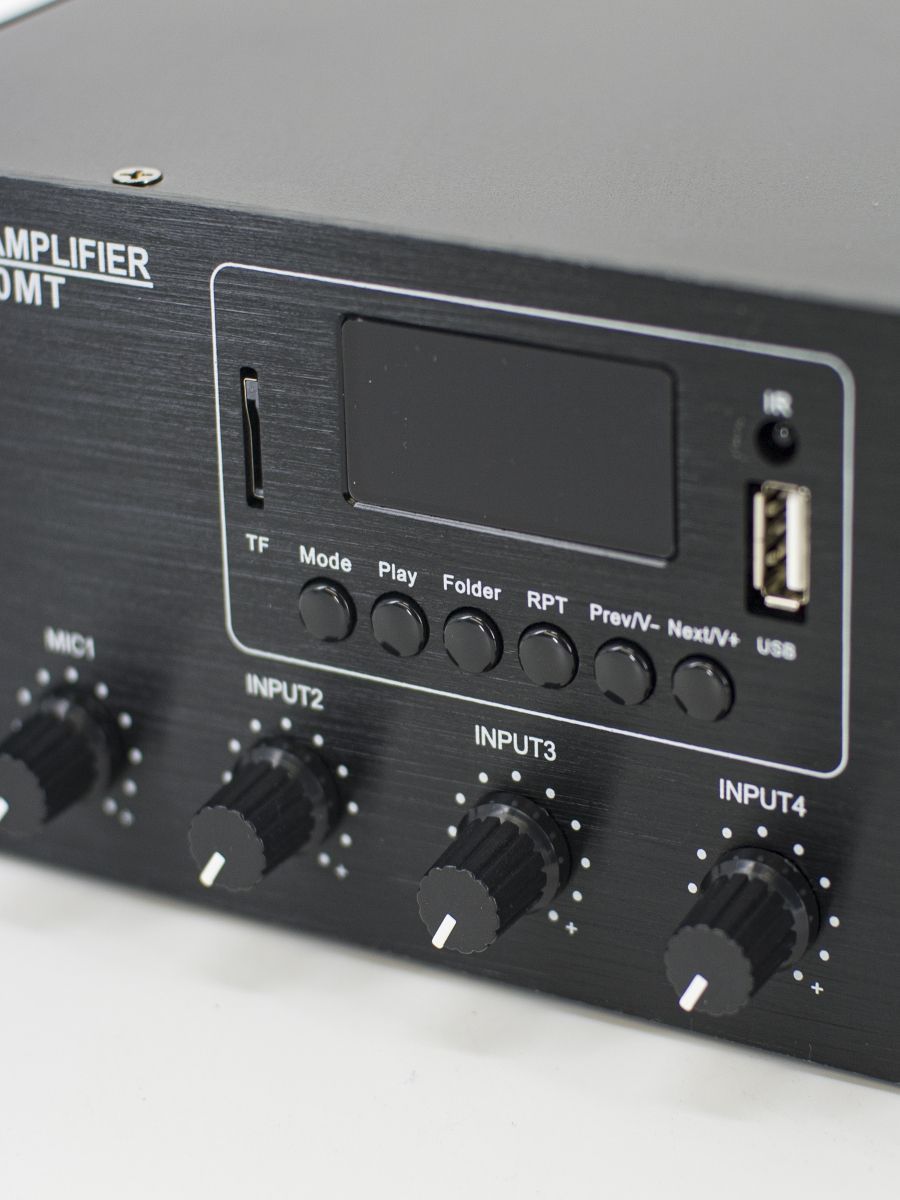 Мощность усилителя, RMS/пик: 500 Вт Входы: 4 Mic, 3 Aux Выходы: 70V/100V/4-16ohm Размер (ШхВхГ): 484×88х405 мм Вес: 14,5 кг Дополнительно: Mp3, SD, USB, BT, FM тюнер, 6 зон аттенюатор