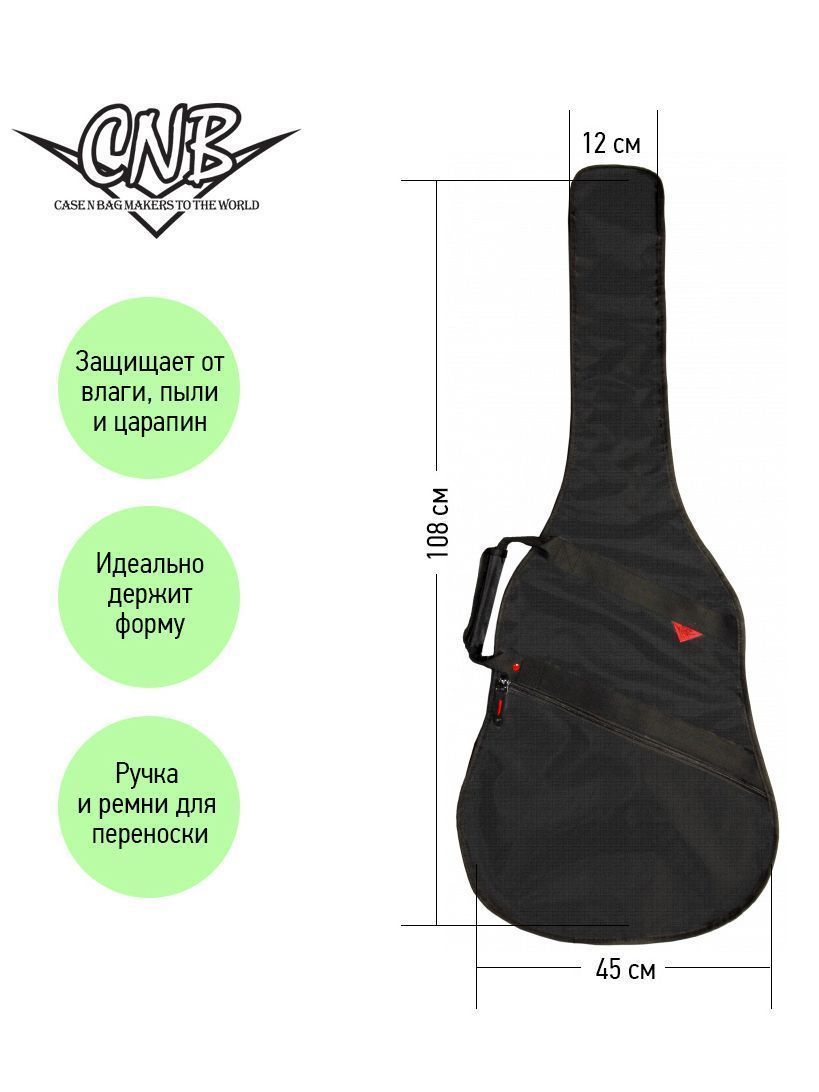 CNB DB380 – это стильный и качественный чехол для акустической гитары. Главное назначение модели CNB DB380 – оберегать инструмент от внешних воздействий окружающей среды, которые негативно сказываются как на внешнем виде гитары, так и на ее звучании. Чехол изготовлен из водонепроницаемого нейлона плотностью 600 D без дополнительного утепления. Чехол закрывается на прочную молнию с крепкими зипперами. Модель имеет большой наружный карман для хранения нот и гитарных аксессуаров. Заплечные ремни позволяет с удобством переносить гитару за спиной. Для транспортировки инструмента в горизонтальном положении имеется прочная боковая ручка. Чехол CNB DB380 создан не только для надежной защиты инструмента, но и для вашего комфорта. Характеристики: Размер: 4/4 Материал: нейлон Плотность: 600 D Размеры: 108х45х11 см Страна-производитель: Китай