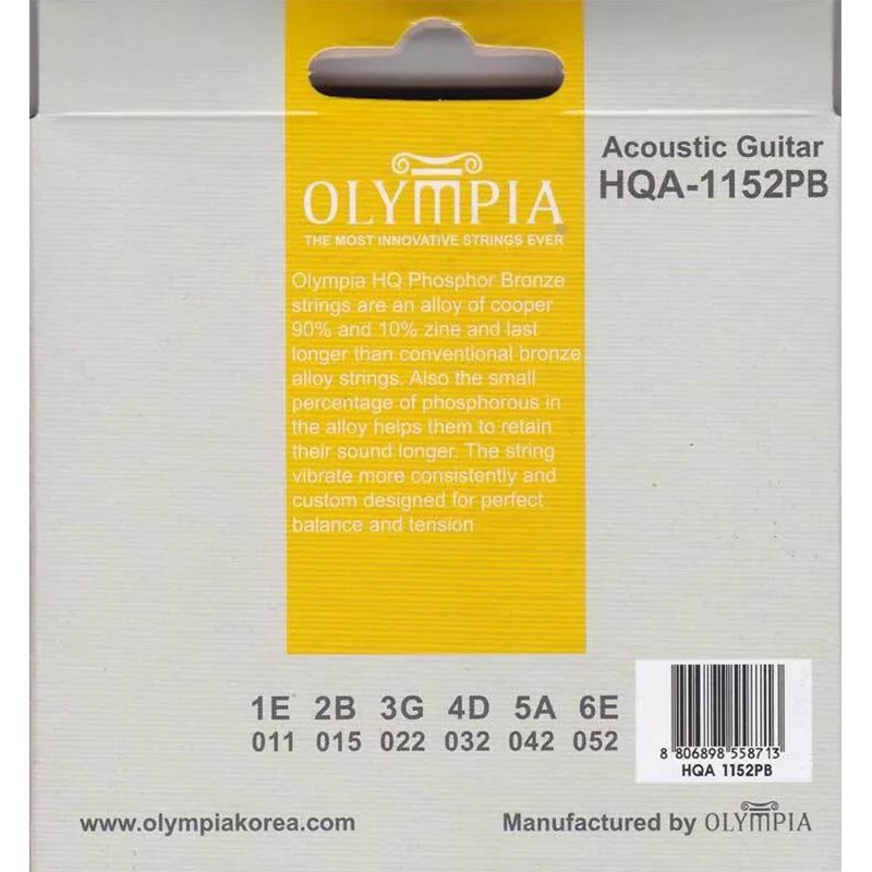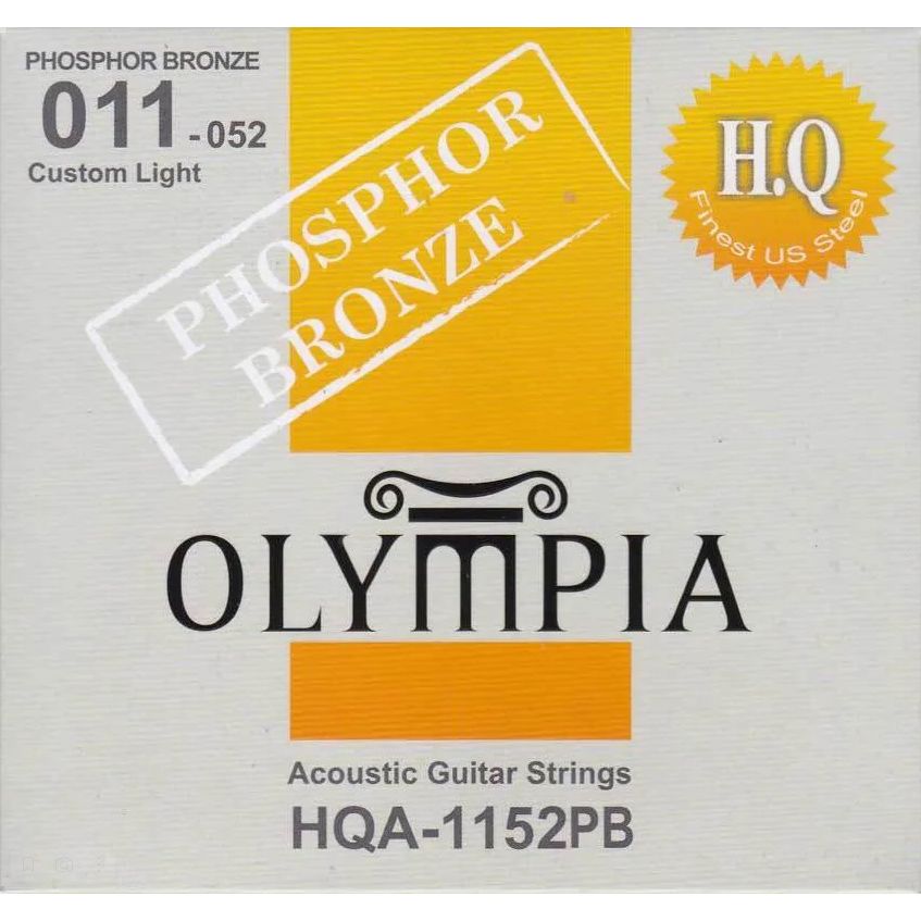 OLYMPIA HQA-1152PB Phosphor Bronze Custom Light 11-52 струны для акустической гитары, (фосфор, бронза). Струны Olympia HQ Phosphor Bronze состоят из сплава 90% меди и 10% цинка и служат дольше, чем струны из обычного бронзового сплава. Также небольшой процент фосфора в сплаве помогает им дольше сохранять звук. Струны вибрируют более равномерно и специально разработаны для идеального баланса и натяжения.